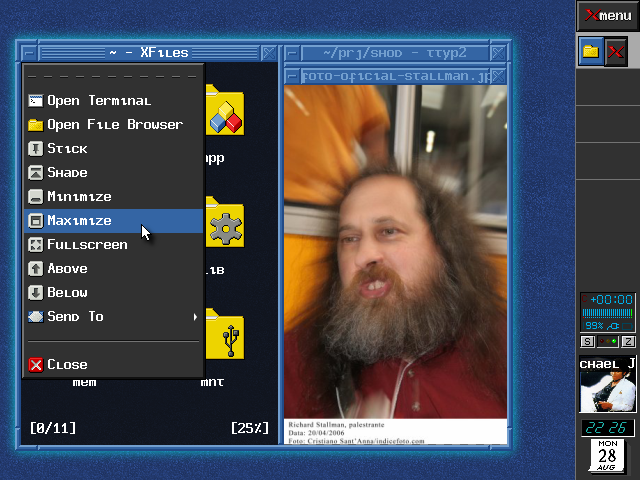 Shod has no desktop panel or bar; but it features a dock where dockapps (small windows commonly used on other window managers like WindowMaker) can be placed on. The dock does not appear unless a dockapp is opened.