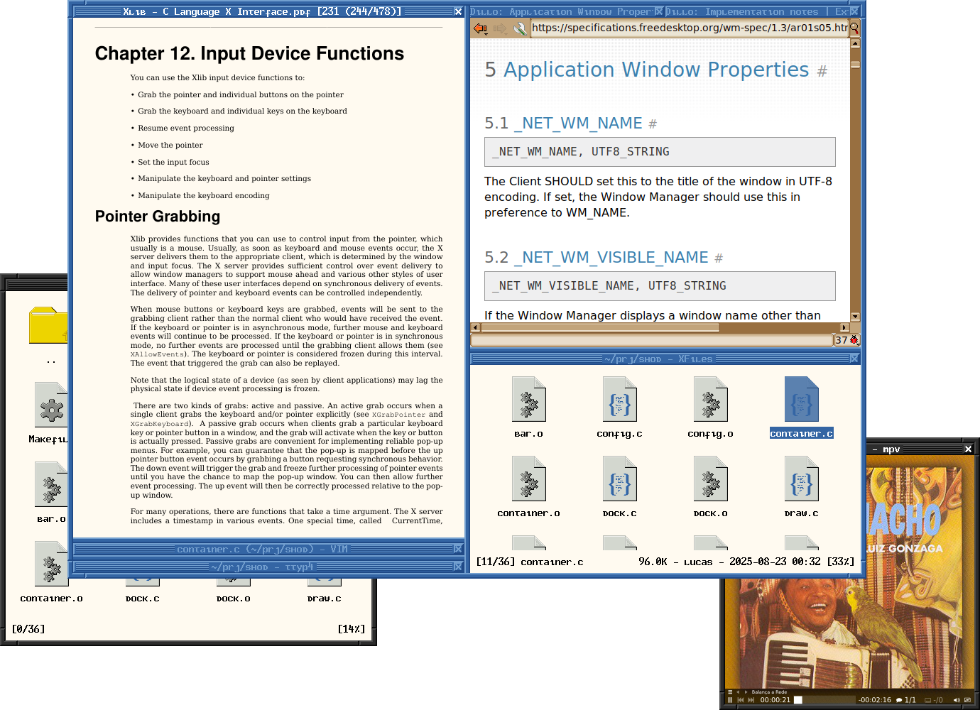 Application windows can be tiled and tabbed together into a meta-window called “container”. Containers float around on the screen and stack on top of each other just like in other stacking window managers.